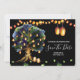 Uma ilustração maravilhosa e vibrante com um grande carvalho repleto de falsas lanternas suspensas e luzes de cordas contra um fundo preto da meia-noite. As bordas superior e inferior têm cestos ovais de ratos mais velozes que são iluminados contra o céu noturno. Folhas verdes pequenas estão espalhadas abaixo da árvore e modelos brancos aparecem à direita para seus detalhes personalizados. Estes são ideais para a queda do país rústico/anúncios de outono, verão, primavera ou inverno "salve a data". Essas cartas chatas luxuosas e elegantes vão deliciar seus convidados.