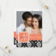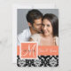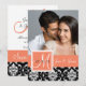 Cor rosa cor-de-rosa cor laranja pêssego Elegante com monograma branco com Cor damasco de imagem branca e preta Salve as placas planas de data com sua foto do Noivado. Design de layout por Elke Clarke©. Gráficos licenciados. Personalize inserindo sua foto de noivado, informações pessoais e salve a mensagem de data no verso. Personalizável. Basta clicar no botão "PERSONALIZAR".