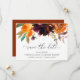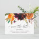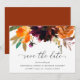 Rústico boho floral casamento Salve a Data com um buquê floral pintado aquarela com tons quentes e terrosos de laranja queimada, terracota e borgonha profundo junto com alguma folhagem. Este Salve a Data elegante com os tons ricos do outono é ótimo para um casamento de outono.