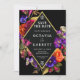 Este elegante e formal casamento floral salva o cartão de data com flores roxas, vermelhas e laranja em fundo preto. O texto branco preto faz com que você salve os detalhes da data realmente pop. Uma bela tipografia de letras douradas decoradas com flores é colocada no verso. Este item faz parte da Coleção de Datas de Salvamento à Meia-Noite.