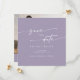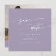 Esta foto do quadrado roxo de lavanda bófia salva o cartão é perfeito para um casamento minimalista. A design boêmica roxa e poeirenta, roxa, apresenta uma caligrafia rústica simples com um estilo único, mas clássico. Personalize sua data de salvamento com seus nomes, data do casamento, local, foto do noivado e endereço do site do casamento.