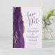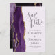 A borda esquerda deste elegante casamento moderno salve o cartão de data apresenta uma borda de agata púrpura aparada com falso brilho dourado. O texto personalizável combina a escrita manual de cinzas de carvão, fontes copperplate e itálico em um fundo de lavanda pálido. O verso apresenta um design de agate roxo e dourado correspondente.