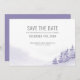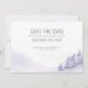 Casamento no inverno salve a placa de data com design de cor d'água cênica em tons de lavanda e cinza. A cena da neve apresenta uma paisagem romântica de floresta montanhosa com pinheiros, derivas e um nevão leve. O texto é editável e, se você quiser combinar produtos, navegue na minha coleção de Florestas de inverno.