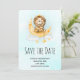 Festa de aniversário ou chá de fraldas salve a placa de data com uma ilustração de aquarela fofa. Um adorável leão vestindo uma coroa pescando estrelas sentadas em uma lua crescente descansando em uma nuvem fofinha. Ilustração de fantasia mágica. Fundo de aquarela azul claro.