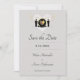 Salve a placa Date com um design de dois grupos, posicionado em ambos os lados de um coração dourado, todos sobre um fundo de cinza. Este item faz parte de um conjunto de casamento que inclui um convite para casamento, um cartão Rsvp e muito mais. (Os elementos dourados do sortido são ouro falso e não folha de ouro.)