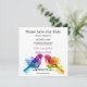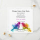 Apresentando o Casamento "Rainbow Lovebird" Salve o Cartão de Data! A frente desta placa quadrada apresenta um trabalho de arte de aquarela cativante de duas aves intricadamente representadas viradas uma para a outra em meio às cores vibrantes da bandeira do orgulho LGBTQ+. Estes pombinhos simbolizam unidade, amor e inclusividade, criando um impressionante ponto focal contra o fundo branco sereno. Do lado direito, os nomes dos casais e a data do seu casamento são apresentados elegantemente, assegurando que os hóspedes saibam quando marcar os seus calendários. Abaixo, é fornecida a localização do local, garantindo que os convidados tenham todas as informações necessárias. Uma solicitação personalizável adiciona um toque pessoal, onde o casal pode incluir quaisquer solicitações ou detalhes específicos para seus convidados. A parte traseira da placa apresenta o mesmo trabalho de arte cativante dos pombinhos contra o fundo branco sereno, fornecendo um design coeso e atraente visualmente. Abaixo do trabalho de arte, há um espaço para uma mensagem personalizada do casal. Isto poderia ser uma nota de gratidão sentida, uma memória especial, ou qualquer outra mensagem que o casal queira transmitir aos seus convidados. Os nomes dos casais também estão incluídos, garantindo que o convite é deles. Além disso, há informação sobre o seguinte convite, antecipando o que virá. Por último, está disponível uma linha adicional para qualquer mensagem adicional, como um endereço de site de casamento ou qualquer outra informação importante que o casal queira compartilhar. No geral, o "Rainbow Lovebird" Wedding Save the Date Card é uma escolha maravilhosa e elegante para casais que querem convidar seus convidados para testemunhar e celebrar seu dia especial. Com seu trabalho de arte cativante, espaço de texto personalizável e um espaço para uma mensagem personalizada, este cartão garante que os convidados tenham todas as informações necessárias e, ao mesmo tempo, forneça um toque pessoal do casal.
