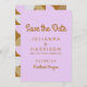 Anuncie seu dia especial com esses cartões modernos e na moda! Apresentando uma frente de lavanda suave com tipografia em ouro ousada, esta design é elegante e divertida. O dorso mostra um padrão geométrico contemporâneo em ouro e branco, acrescentando um talento único e artístico. Perfeito para definir o tom do seu casamento, esses cartões são personalizáveis com seus nomes, data e local. Disponível como um arquivo para download para fácil compartilhamento ou como cartões impressos profissionalmente para um toque elegante e memorável. Uma maneira chique de garantir que seus hóspedes marquem seus calendários para o seu grande dia!