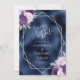 Este elegante casamento moderno, exceto o cartão de data, apresenta uma imagem geométrica prateada decorada com buquês florais lilás, roxas e prateadas num fundo azul marinho. O texto personalizável combina a escrita manual imétrica de cinzas prateadas, a placa de cobre e as fontes itálicas.