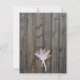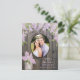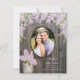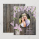 Este lindo cartão de salva data de casamento apresenta sua foto rodeada por lilases de primavera com luzes brancas em um fundo de madeira de celeiro envelhecida. O texto é de uma cor lavanda pálida ou roxo claro. Lindíssimo para uma cerimônia ao ar livre ou em um quintal rústico.