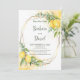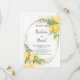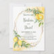 Flores Amarelas limões Eucalyptus Salvem o Cartão de Data. O estilo romântico com limões de aquarela, flores amarelas e eucalipto é perfeito para um casamento de verão rústico. A estrutura geométrica de folha de ouro falso adiciona um toque moderno. A impermeabilização complementa a composição e confere-lhe um charme especial.
