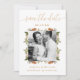 Este adorável Casamento Salve a Data apresenta uma bela caligrafia dourada e uma bonito foto floral e verde de aquarela na frente, e um sólido fundo verde.