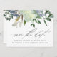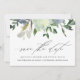 Este adorável Casamento Salve a Data contém lindas flores azuis e brancas e empoeiradas com verde-luxuoso e caligrafia elegante.