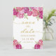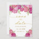 Diga aos seus entes queridos para Salvar a Data do seu casamento com este cartão branco elegante com belo buquê floral em tons rosa e roxo de rosas aquareladas, folhas verdes e detalhes em dourado.