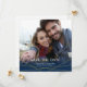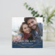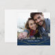 Este cartão de anúncio de casamento com data de salvar quadrada apresenta uma moldura de foto que preenche toda a frente do cartão. Um gradiente azul-marinho e linhas douradas simples acentuam a parte inferior da foto. O texto personalizado permite que você adicione os nomes da noiva e do noivo e a data e local do próximo casamento.