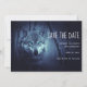 Salve o cartão de data com uma imagem de um lobo mágico místico parado numa floresta com neve suave a cair. É impressionante que os olhos azuis realmente chamam sua atenção.