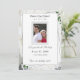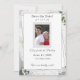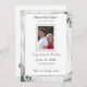 White Lace e Rosa deixam o casamento Salve a design de data apresenta a sua foto emoldurada no centro com as informações exibidas contra um suporte branco. O plano de fundo apresenta a imagem de um local branco. Folhas de rosa verde são delicadamente posicionadas nos cantos. O reverso apresenta um fundo branco com um rosa sépia do solteiro exibido no canto inferior direito.