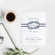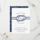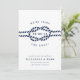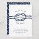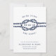 Anuncie seu casamento para a família e amigos com esses cartões salve a data de chic costeiros em azul e branco clássicos de marinho. Design apresenta uma ilustração de corda com nós com a data do casamento no centro, cercada por "estamos casandos!" Personalize esses cartões salve a data náuticos com seus nomes, data do casamento, local e site do casamento, ou uma indicação de que seguirá um convite formal. Cartões que se revertem a um padrão de corda náutica de looping, de cor branca, em marinho.