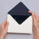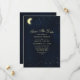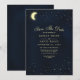Cartão de Salvar Data Lua Celestial Estrelas Azul Escuro. Este design apresenta luzes de estrelas cintilantes com uma lua crescente brilhante no céu noturno estrelado.