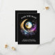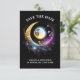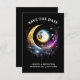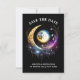 Uma bela lua branca de cheio 3D parece brilhar contra um fundo preto da meia-noite e é enquadrada por uma lua azul, magenta e de ouro que tem pequenas estrelas cintilantes. Esta ilustração chica e na moda é ideal para uma quinceanera noturna estrelada; uma festa de aniversário especial lua e estrelas; um noivado celeste; um casamento sobre a lua; uma festa temática de aniversário de um vidente cigano ou um evento de mercado wiccan.