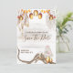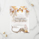 Uma ilustração maravilhosa e vibrante com belas penas de macramê penduradas atrás de luzes de corda cintilantes e lanternas penduradas. Um lindo bolo de casamento branco adornado com orquídeas e flores de anêmona repousa atrás de velhos galhos de madeira sobre os quais lanternas de vime e uma vela de lanterna repousam. Estes são ideais para anúncios "salve o dia" rústicos de campo para outono, verão, primavera, safári africano ou inverno. Estes cartões planos luxuosos e elegantes irão deliciar seus convidados.