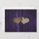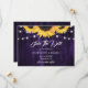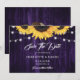 Cartão de aviso de casamento floral roxo e amarelo rústico com flores de girassol e luzes de corda em um fundo de madeira rústica.