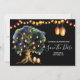 Uma ilustração maravilhosa e vibrante com uma grande árvore carvalho cheia de lanternas penduradas brilhantes e luzes de cordão colocadas contra uma cor de fundo de sua escolha. As bordas superior e inferior têm cestas de vime oval que são iluminadas contra o fundo dourado. Folhas verdes pequenas estão espalhadas abaixo da árvore e modelos brancos aparecem à direita dela para seus detalhes personalizados. São ideais para anúncios rústicos de "salve o dia" de outono, verão, primavera ou inverno. Esses cartões planos luxuosos e elegantes irão deliciar seus convidados.