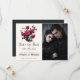 Buquê floral gótico moderno em tons de cor rosa-cereja e folhagem escura-escura-esverdeada - adicione sua foto à direita - fontes de caligrafia estilo gótico - código QR na parte traseira para informações sobre o casamento. Fácil de personalizar com seus detalhes.