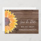 Madeiras Russas Modernas De Girassol Salvem O Anúncio De Data. Girassóis trazem alegria! Avise sua família e amigos quando seu dia especial estiver chegando com este simples casamento de girassol de na moda, salve nosso cartão de data decorado com um girassol de cor amarela em um fundo de madeira. Original Watercolor © Michele Davies.