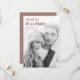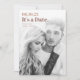 Uma tipografia moderna, salve a design de data com uma foto vertical ou de retrato de cheio sangrando, com seus detalhes de casamento alinhados no topo. Sua data de casamento, "É um Encontro", seus nomes e locais de casamento aparecem em letras tonais e terracottas. Adicione detalhes adicionais, como o site do seu casamento, às costas.