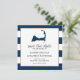 Guarde o Anúncio de Casamento de Data para o seu casamento em Cape Cod. Mapa de Cape Cod (Massachusetts do Sudeste). As cores estão em uma borda de areia do Ouro Think e Stripes Azuis Escuras com um coração vermelho sobre a localização FALMOUTH. Para obter informações sobre alterações de design personalizadas pelo designer independente, envie um email para paula@labellarue.com ANTES de personalizar ou fazer um pedido.
