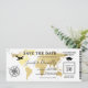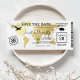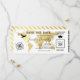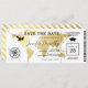 Cartão de embarque de graduação salve o convite de tíquete de data com um mapa de destino de folha de ouro elegante, bússola, avião, boné de formando e um modelo de texto personalizado.