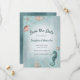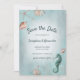 Casamento moderno sobre o tema da praia Salve o Cartão de Data apresenta um fundo azul-d-água do oceano com fundo azul-d-água com cavalo-marinho, conchas e coral. Perfeito para temas de casamento náuticos, tropicais, de verão, de destino, costeiros e "Sob o Mar". Arte original da KL Stock.