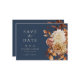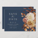 Marinho Queda Salve a Data. Este elegante fã de mão do programa de casamento apresenta cor d'água queimada manualmente laranja e folhas de terracotta, creme e dahlias beges, e belos rosas de cor ferrugem em fundo de marinho. O verso inclui um buquê floral e folha correspondente com mais texto para personalizar. Localize itens correspondentes na Coleção de Romance de outono Azul de Marinho.