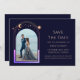 Marinho Místico Arco-Íris Azul Sun Estrela Espaço Salva As Datas apresentam um arco-íris colorido sol, lua e estrelas em um fundo azul marinho. Dentro é a sua foto favorita e o seu personalizado salva as informações de data. Personalize editando o texto nas caixas de texto. Projetado para você por ©Evco Studio www.zazzle.com/store/evcostudio