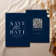 Este clássico salve a data design apresenta um esquema de cores azuis marinho e uma opção de código QR moderna para fornecer suas informações de casamento futuras. Este design é totalmente personalizável com o seu texto e URL para o código QR. Perfeito para um casamento náutico!