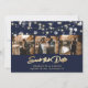 Cartões salve a data de fotos de casamento azuis e douradas, personalizadas e elegantes, com uma letra moderna. O nosso casamento, salvar a data, apresenta uma coleção de fotos de 4 imagens contra um fundo azul marinho adornado com luzes de cordas. Personalize facilmente este marinho azul e ouro, salve o cartão de data com suas imagens e detalhes de casamento, incluindo um site de casamento, se desejar. Para pedidos personalizados, envie-nos uma mensagem.