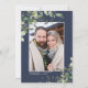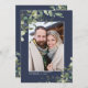 Marinho moderno Blue Rustic Watercolor Eucalyptus Greenery Foto de casamento Salve a data com sua foto de noivado e nosso adorável verde-eucalipto da Califórnia (oeste), verde-víbora botânica moderno e tipografia moderna num marinho azul perfeito. Elegantemente moderno, mas eterno e clássico. Essa design combina os elementos naturais do eucalipto e da mariposa com a tipografia moderna. Perfeito para um casamento rústico ou romântico. Fácil de personalizar com suas informações para uma data moderna e romântica. Entre em contato conosco em cedarandstring@gmail.com se precisar de assistência com o design ou produtos correspondentes.