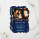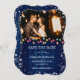 Foto de marinho azul de casamento salvar a data com luzes de Natal e flocos de neve em um fundo de madeira rústica. Personalize facilmente este inverno, salve a data com sua foto e detalhes do casamento.