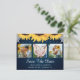 Cartões salve a data de fotos de casamento florais azuis, azuis, marinho, com girassóis e rendas florais brancas em um fundo de gradiente de marinho. Personalize facilmente este cartão com suas imagens e detalhes do casamento. Itens correspondentes disponíveis. O plano de fundo pode ser alterado para qualquer cor.