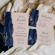A borda esquerda deste elegante casamento moderno salve o cartão de data apresenta um marinho azul de aquarela agate borda aparada com falso rosa dourado. O texto personalizável combina a escrita manual de cinzas de carvão, as fontes em copperplate e itálico em um fundo de blush. O verso apresenta um design marinho de agate azul e rosa dourado correspondente.