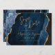 Este casamento elegante salve o cartão de data apresenta uma imagem de fundo da marinho azul de aquarela agada com falso brilho dourado. O texto personalizável combina manuscrito, protetor e fontes itálicas de cor dourada. O verso apresenta um design de agate marinho azul e dourado coordenador.