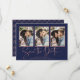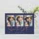 Marinho de Deco de Arte Azul Dourado Manuscrito Salve a data com Cartão com fotos múltiplo em uma fonte elegante e evoca uma sensação romântica manuscrita. Na parte de trás está um design de estilo geométrico, estilo deco de arte, em folha de rosa de ouro cônica, sobre um fundo azul marinho. Projetado para usar três de suas fotos favoritas para personalização adicional. Adicione facilmente seus nomes e datas para um design verdadeiramente personalizado. Entre em contato conosco em cedarandstring@gmail.com se precisar de assistência com o design ou produtos correspondentes.