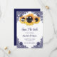 Casamento de girassol azul-rústico marinho personalizado salva os cartões de data com girassóis, lanternas e rendas florais azuis. Itens correspondentes disponíveis para complementar o casamento de chic marinho azul-rústico salve os cartões de data.