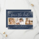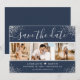 Foto personalizada moderna de marinho azul e prata de casamento salve o cartão de data com uma fonte elegante e uma colagem de fotos em um fundo azul marinho adornado com confete prateado. Personalize facilmente este cartão com suas imagens e detalhes de casamento, incluindo um site de casamento, se aplicável.