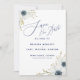 Marinho azul e branco da Boutique Co. náutica O design de Data contém lindos girassóis brancos com anêmonas de cor aquosa com centros azuis. A tipografia moderna e fluente de script é combinada com a tradicional letra de bloco, dando o estilo de escala superior do design. #Náutico #Anemone #SaveTheDate