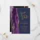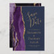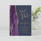 A borda esquerda deste elegante casamento moderno salve o cartão de data apresenta uma borda de agata púrpura aparada com falso brilho dourado. O texto personalizável combina manuscrito dourado, fontes em copperplate e itálico em um fundo azul marinho. O verso apresenta um design de agate roxo e dourado correspondente.