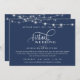 Convide amigos e família para se juntarem ao seu casamento "virtual/online" íntimo com este convite elegante. Frase belíssima de "Casamento Virtual" em caligrafia moderna e escrita à mão. Design com fundo azul marinho e luzes românticas de cordas no topo. A cor de fundo pode ser alterada para outra cor que você quiser selecionando personalizar ainda mais. Frase no topo "Nada de rico, mas o cheio de amor pode ser mudado para qualquer outra frase que você quiser ou até apagar. Adicione sua mensagem, data, hora e seu endereço virtual para que todos possam participar da celebração! Voltar com a mesma cor azul de fundo do marinho, luzes de cordas e o logotipo na moda com noiva e nomes de cheio.