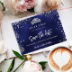 Uma garota e moda Salve o cartão de data para uma Quinceañera, 15 festa de aniversário. Um fundo azul marinho incolor. Decorado com pó falso prateado e uma tiara, coroa. O texto: Salvar a Data é gravado com um script de estilo com letra de tendência grande.
