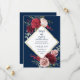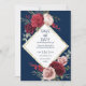 Um design elegante com burgundy vermelha e rosas embaçadas sobre fundo azul marinho. Com um quadro geométrico dourado, delineando a área do texto. Você vai personalizar este belo cartão de encontro com a noiva e os nomes do noivo, data do casamento e local. Por favor, use um formulário abreviado do mês se o mês for superior a quatro letras. Para melhor efeito, utilize todas as letras maiúsculas ou maiúsculas. Os rosas multicoloridos são intercalados com folhagem e verde, criando um spray floral em cantos opostos. Para um casamento que irá incluir burgundy ou marinho como tema de cor, esta é uma excelente escolha.