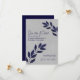 Estes elegantes cartões salve a data de casamento apresentam um design rústico, mas moderno, com ranhuras de folhas de cor azul marinho entrando de ambos os lados da carta em fundo de cinza. A tipografia é única e elegante, com textos justificados tanto à esquerda como à direita. Simples e na moda, estas cartas são a maneira perfeita de deixar seus amigos e família saberem sobre seu próximo casamento.